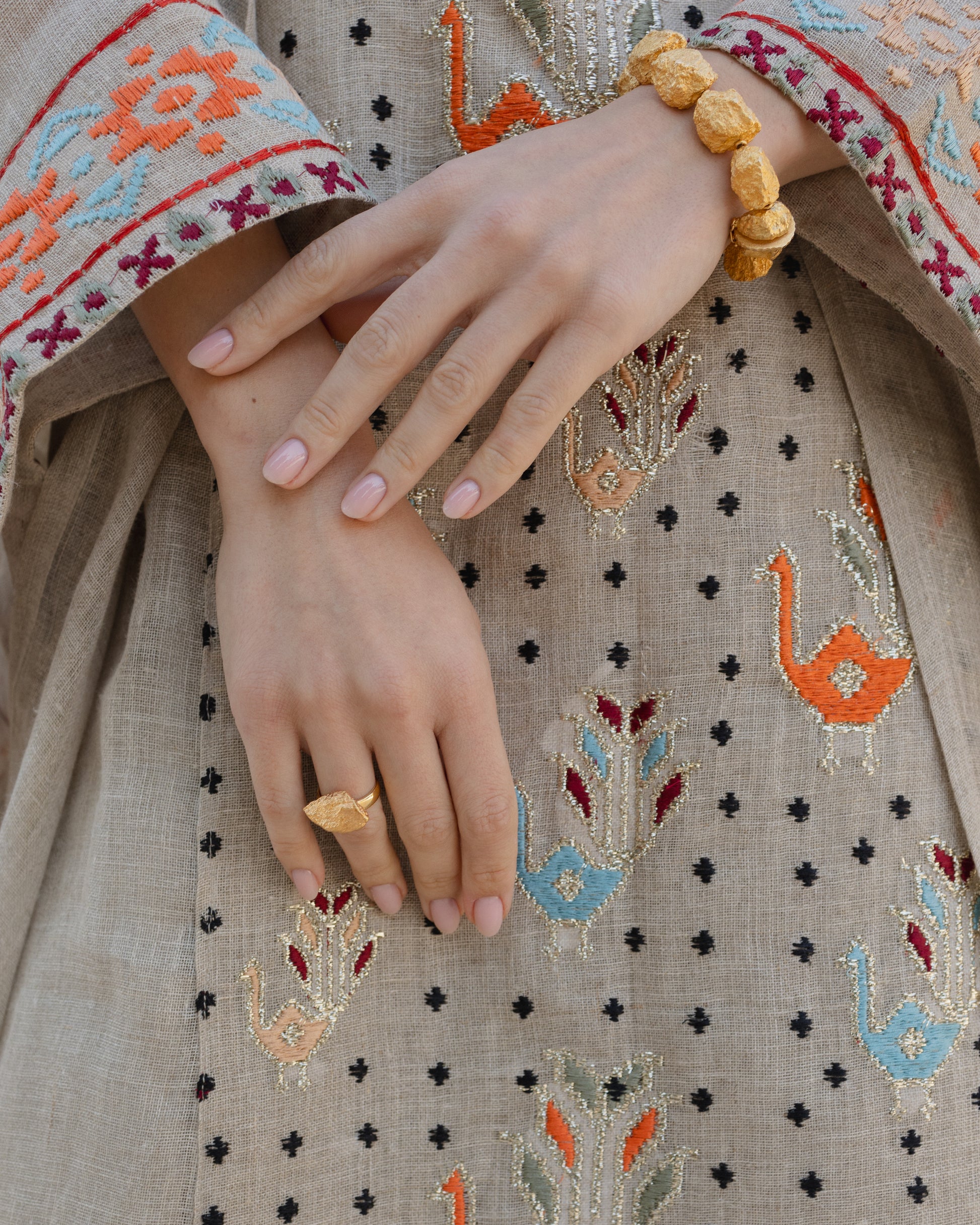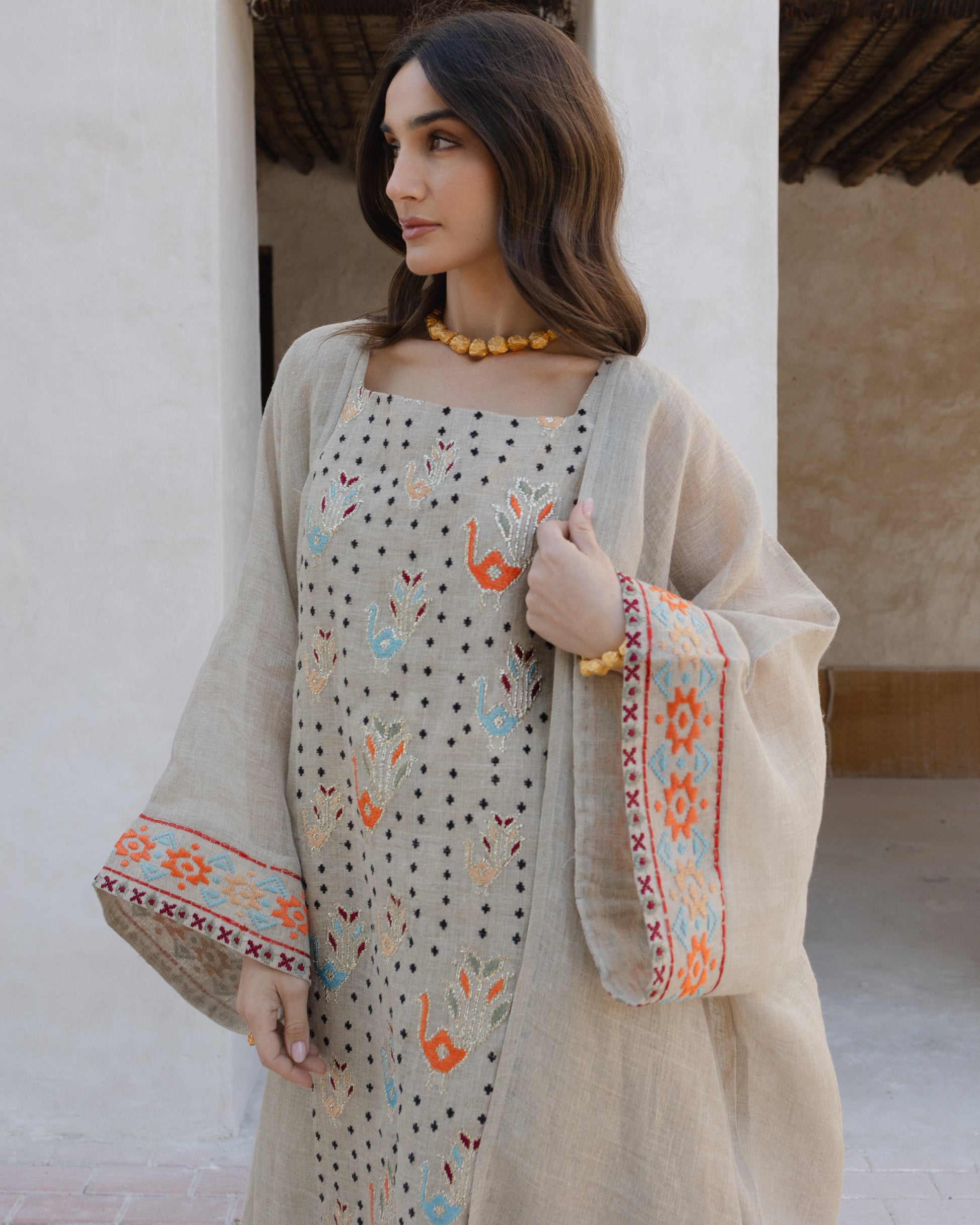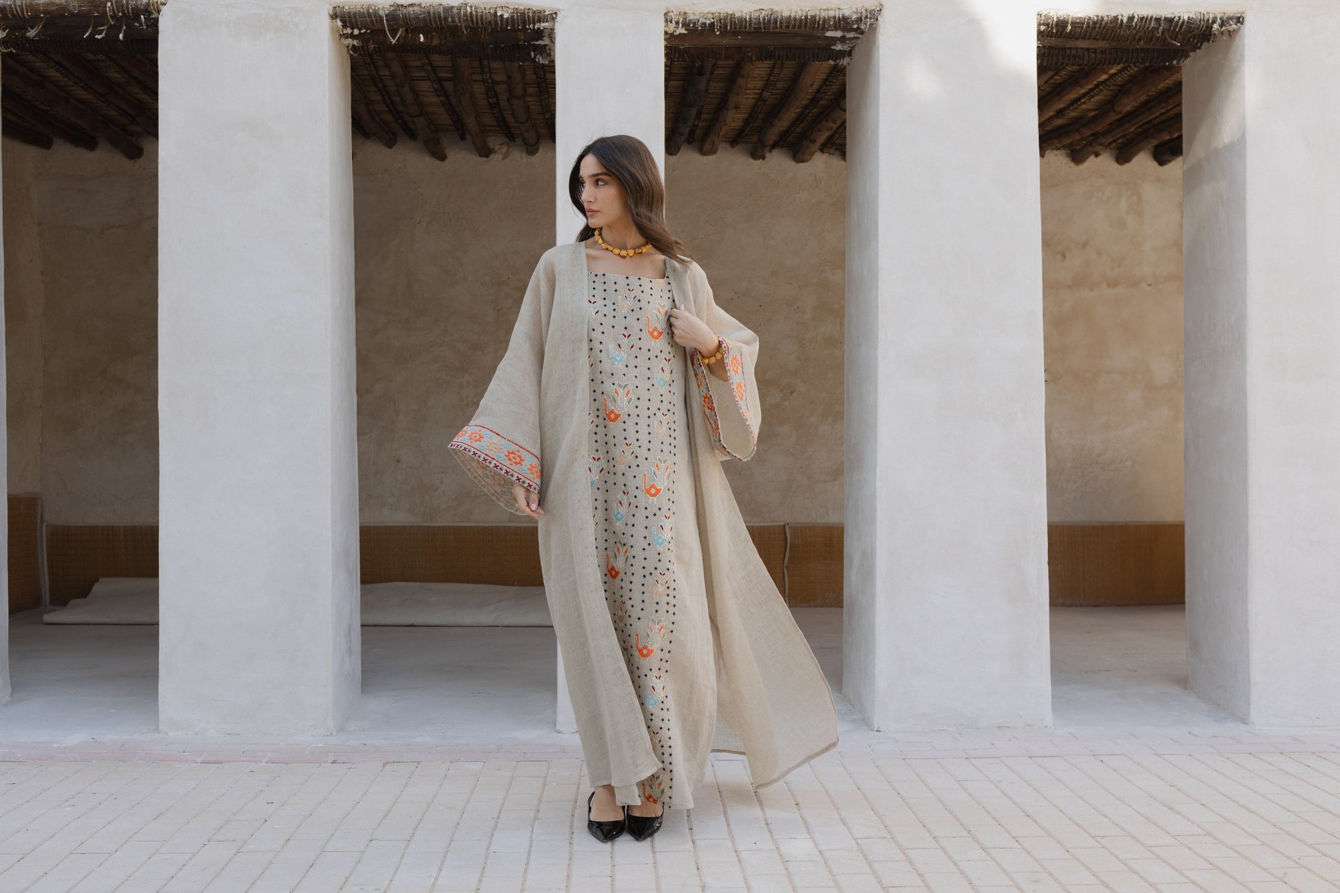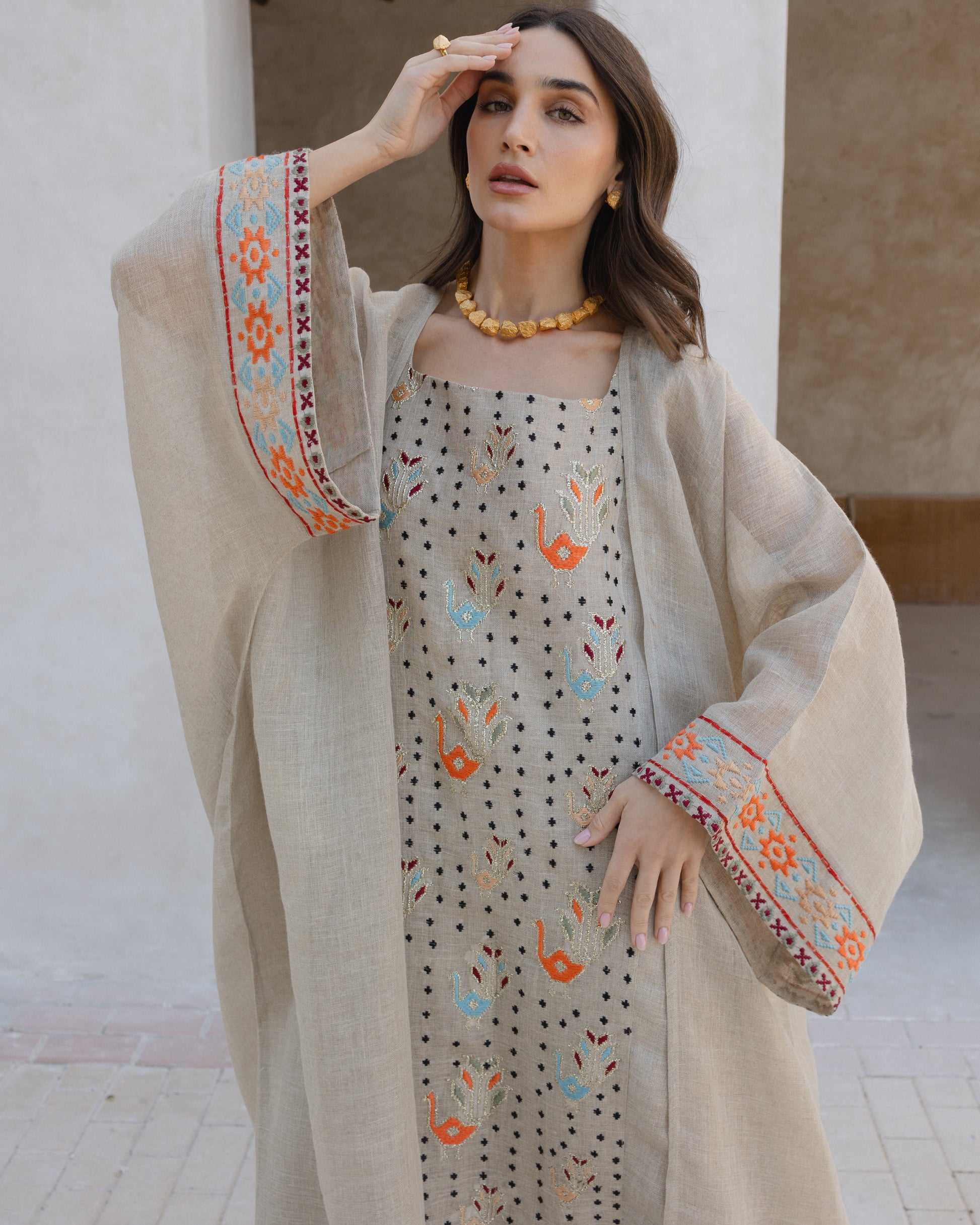 بشت وفستان مصنوع من الكتان (اللينين) بتفاصيل مميزة على الأكمام، يتميز بتصميم أنيق ويعتبر قطعة أساسية تضفي لمسة استثنائية على إطلالتك، يمكن تنفيذ أي تصميم معروض حسب الطلب وبالمقاس المناسب