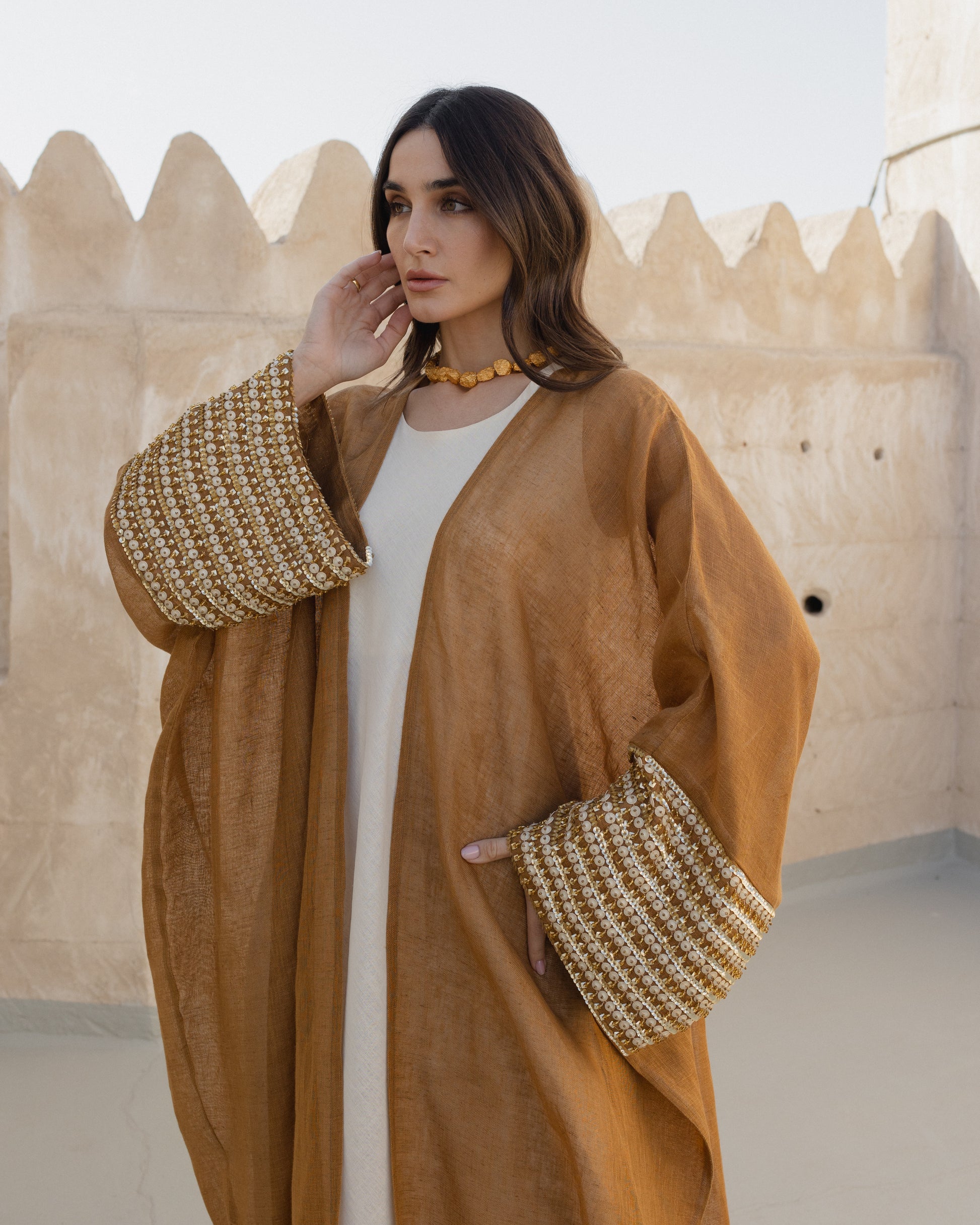 بشت وفستان أنيق مصنوع من الكتان الناعم (اللينين)، بتفاصيل منسوجة يدويًا على الأكمام، ومزين بتطريزات ساحرة تضيف لمسة راقية، يمكن تنفيذ أي تصميم معروض حسب الطلب وبالمقاس المناسب