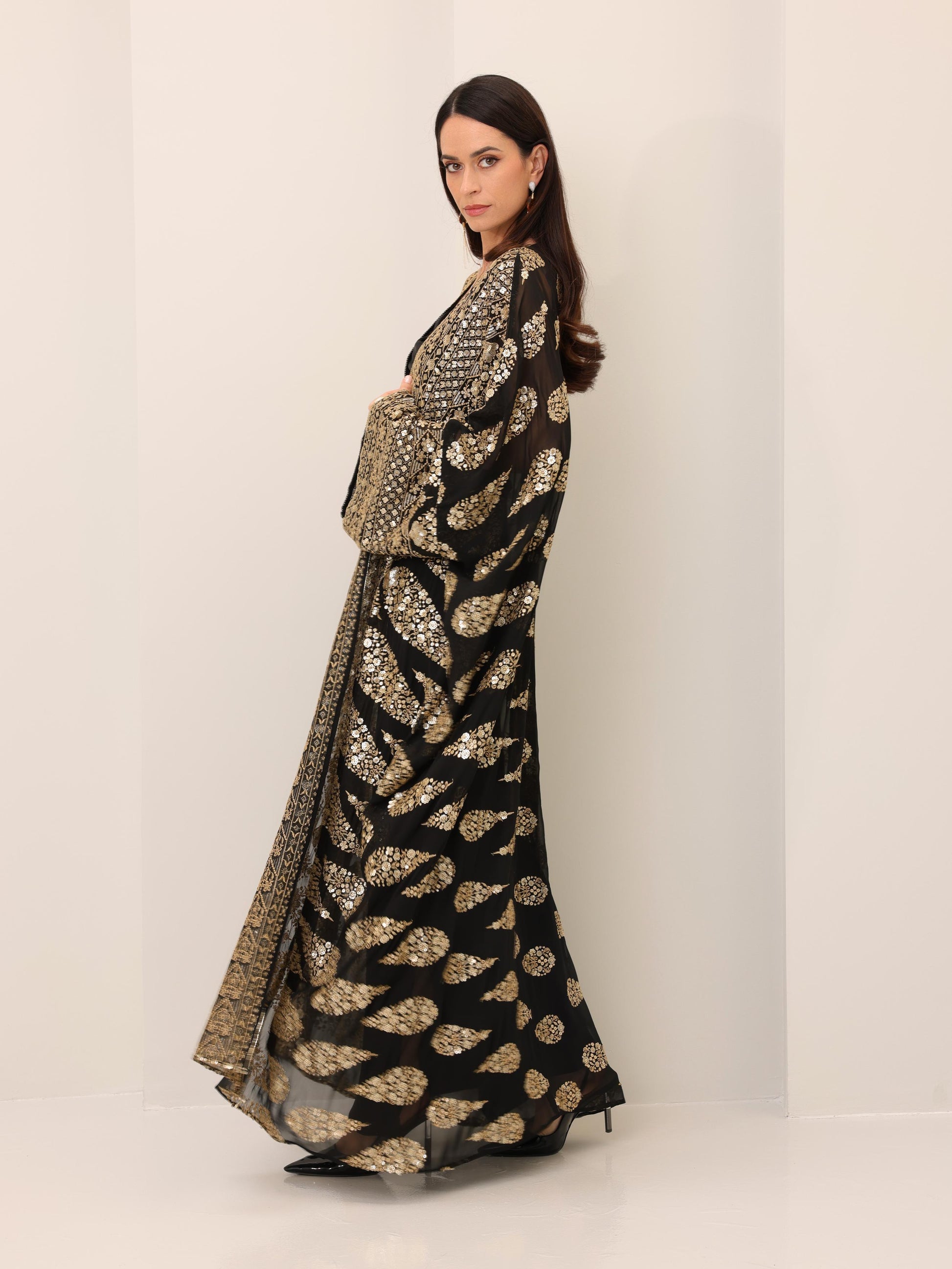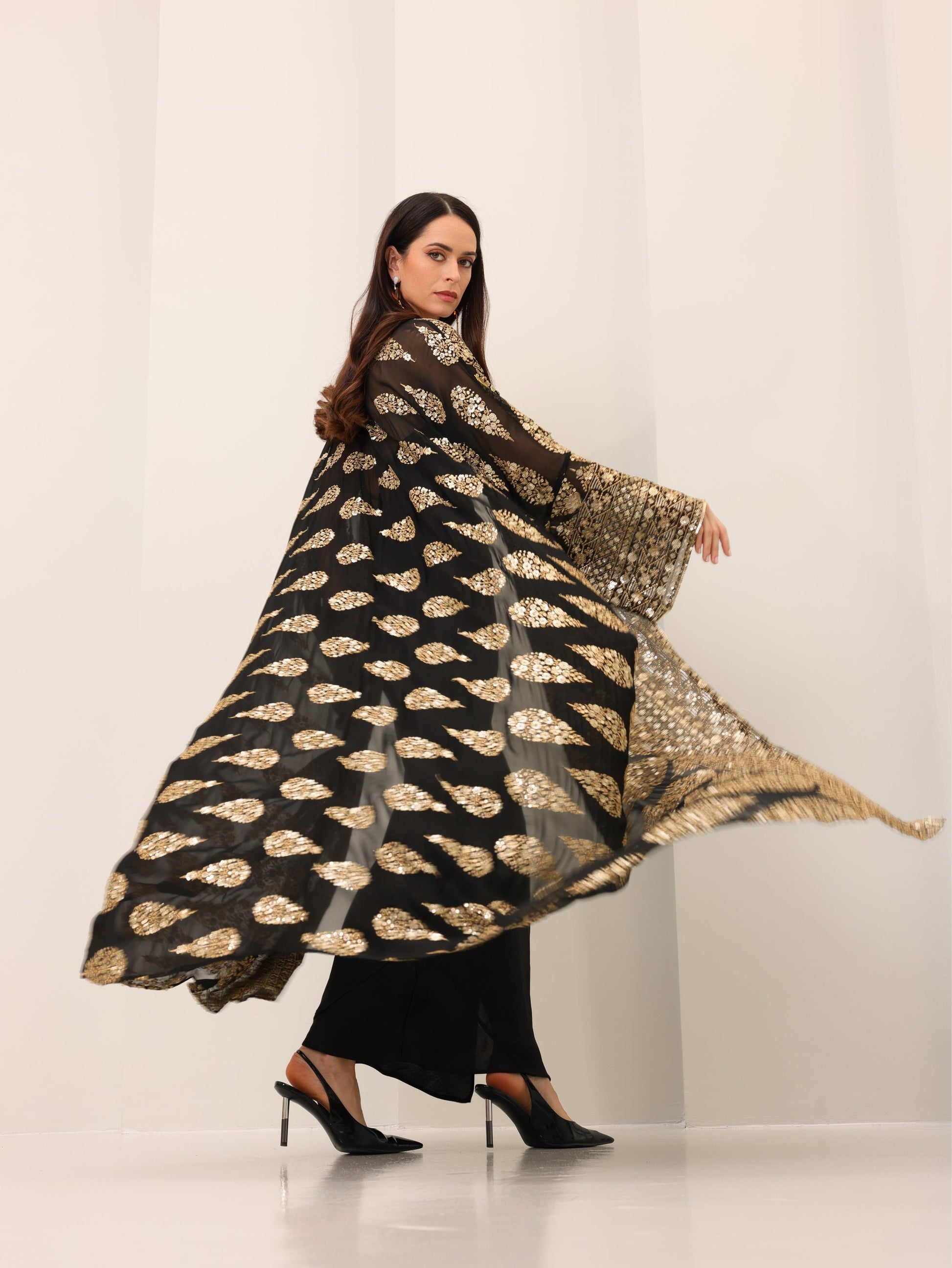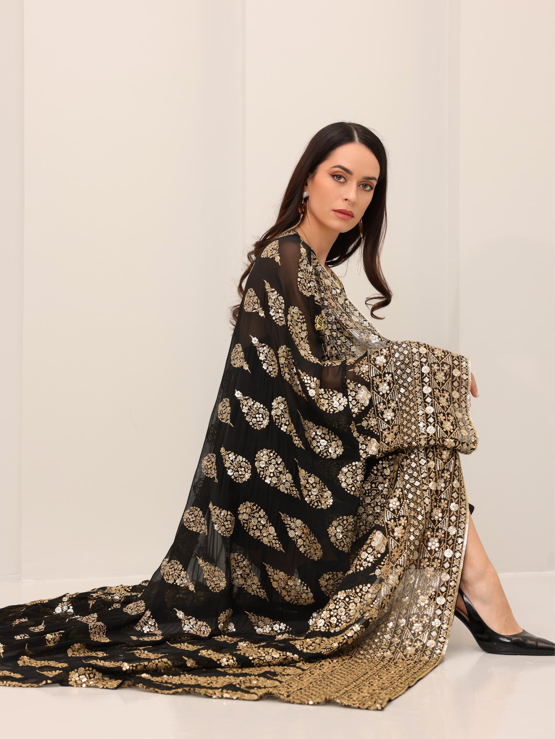 Kashmiri Work With Gold Sequins Embroidery On Black chiffon Bisht
